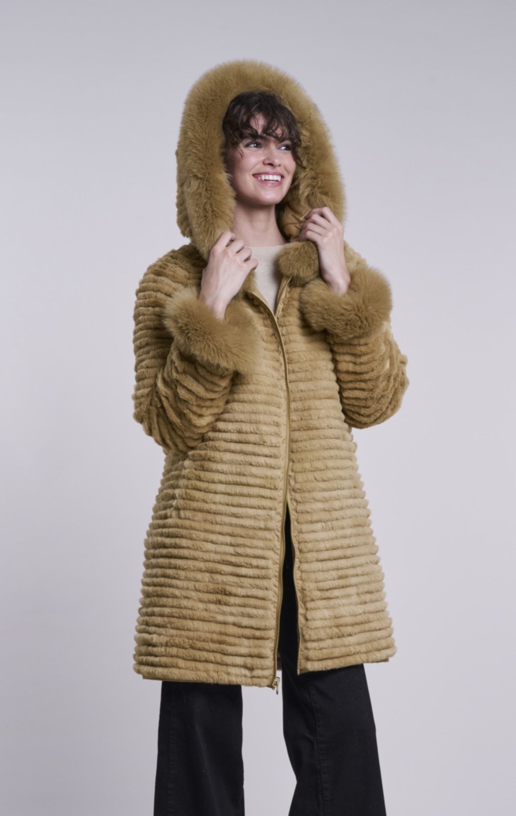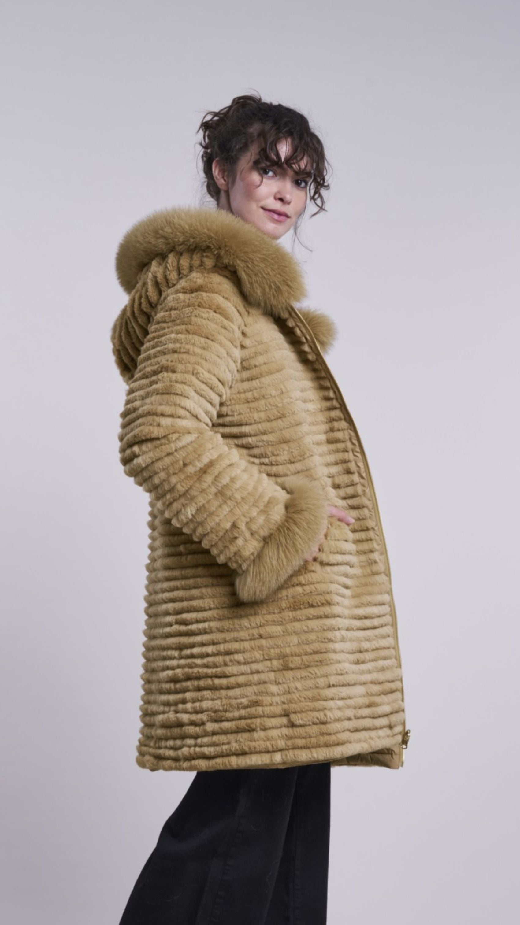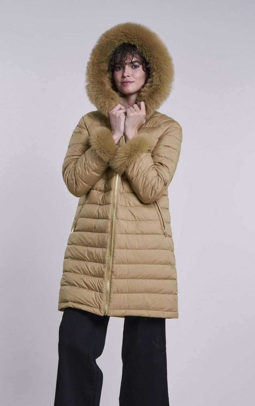 Warm and cozy without the added weight of a typical puffer, this straight-down winter staple is perfect for everyday wear. Reverse to reveal either layered rabbit shearling or glamorous fox trim.