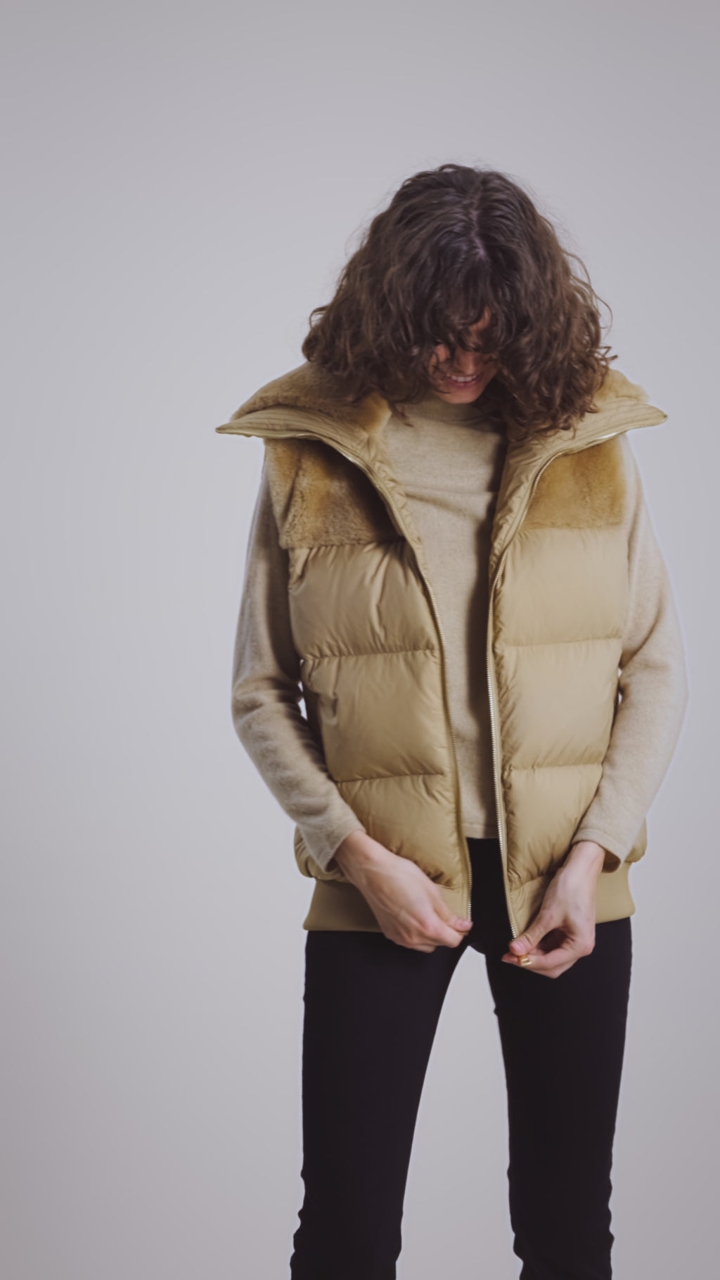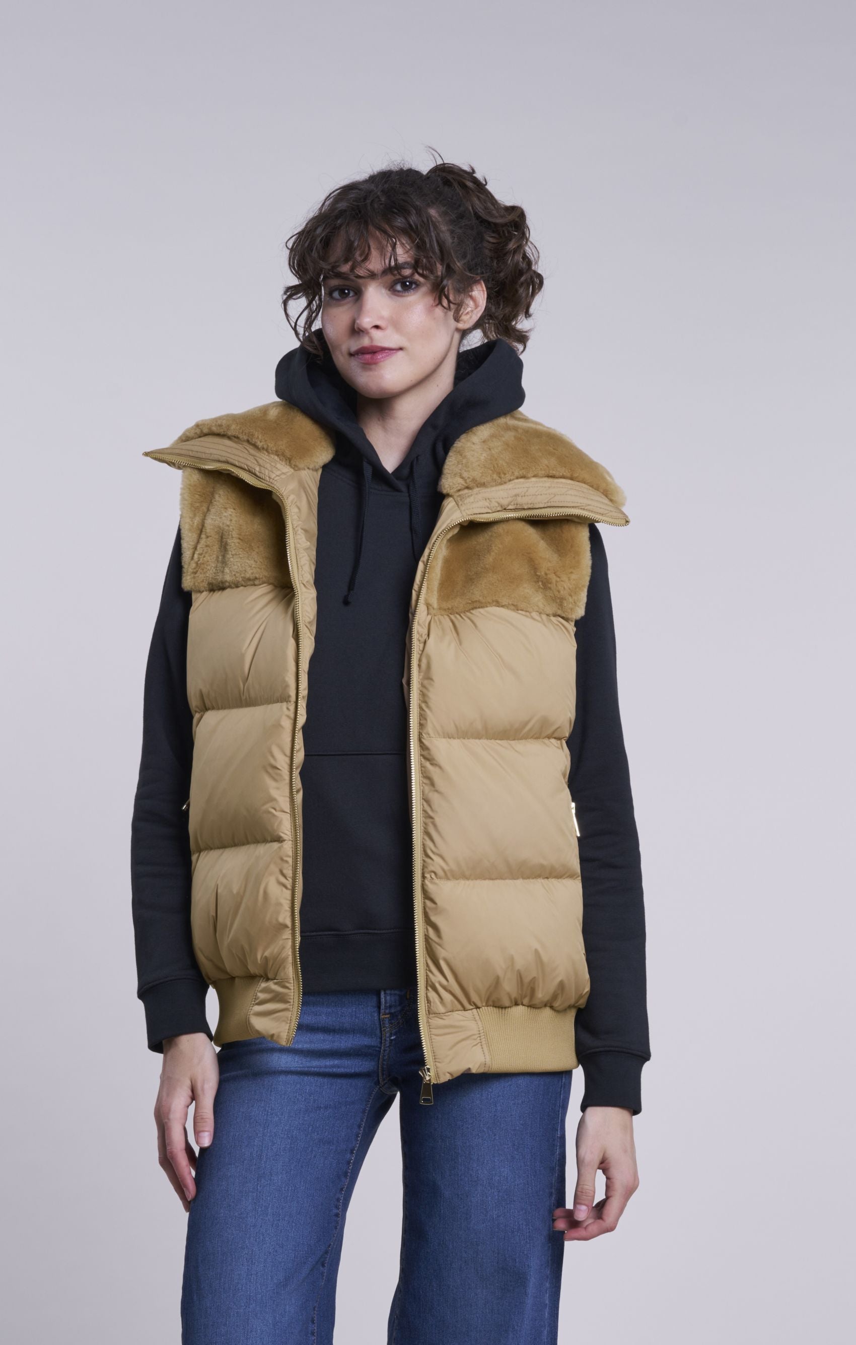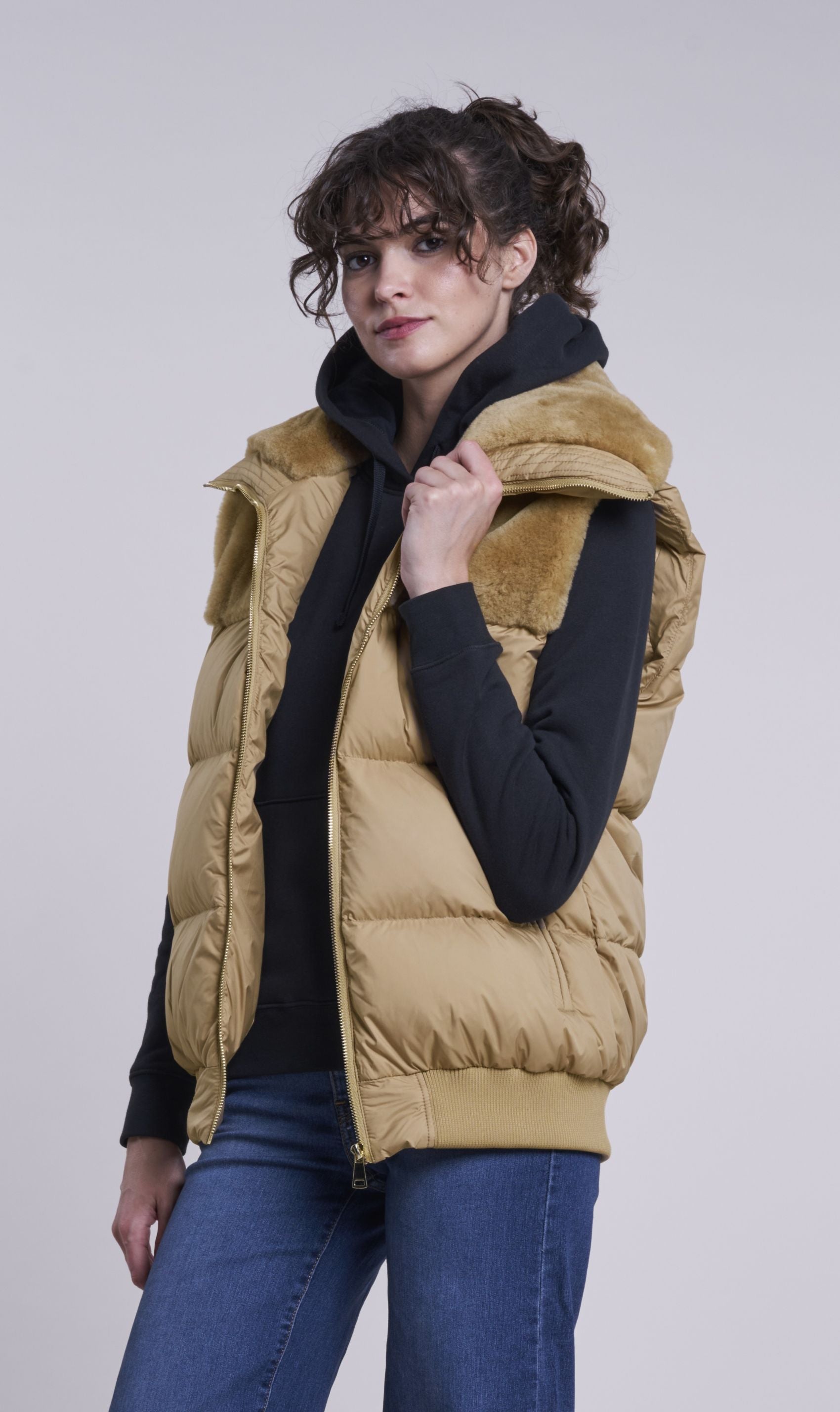 Best vest yet. Fluffy soft warm down accented with genuine shearling yoke and snuggly collar. Wear in comfort over all your fall and winter wear