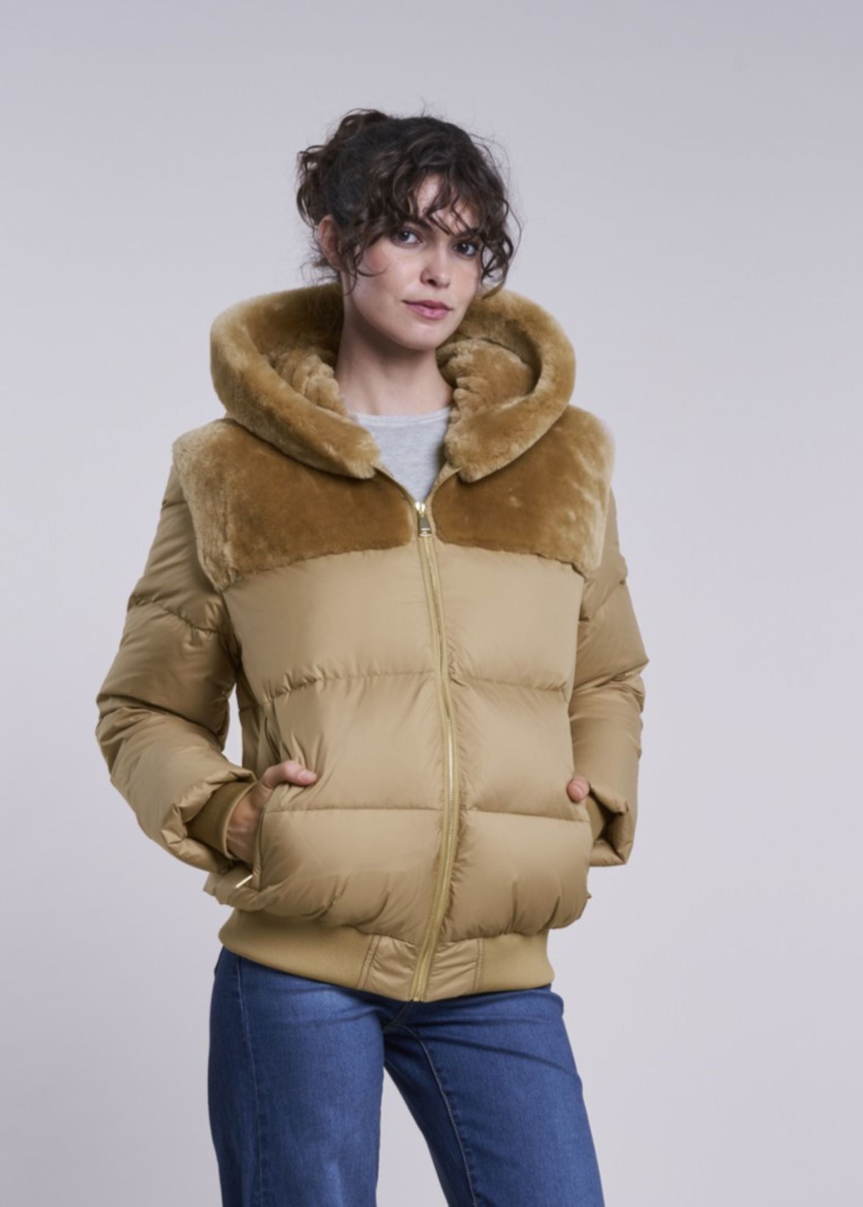 215HDC Down hooded jacket with shearling yoke 1/2 price GIFT OF WARMTH now $225
