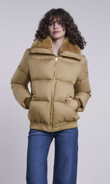 Feather weight down jacket, matching knit border and cuffs topped with a soft warm Australian shearling collar. Gold zipper closing and pocket detail. As warm and practical as it is good looking.