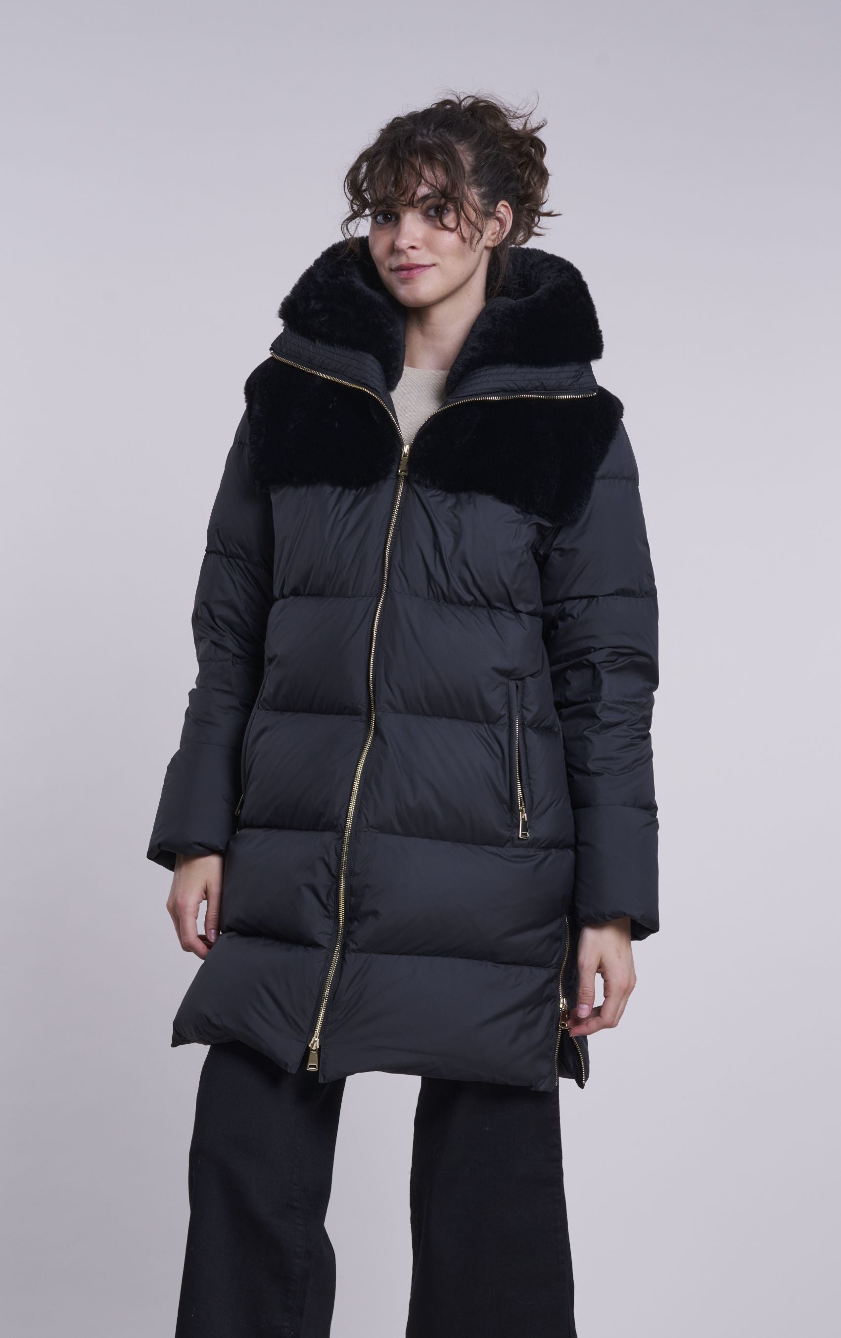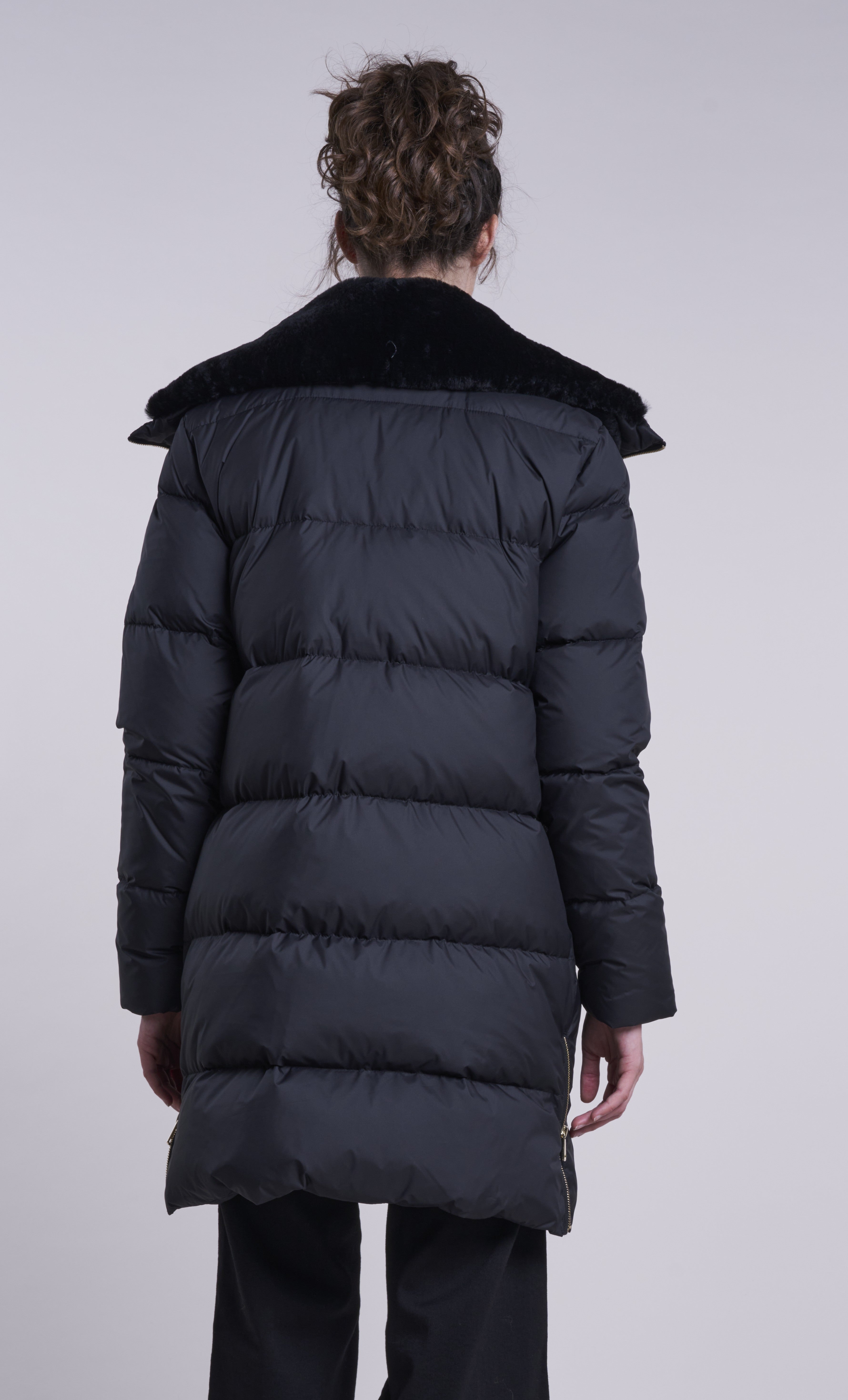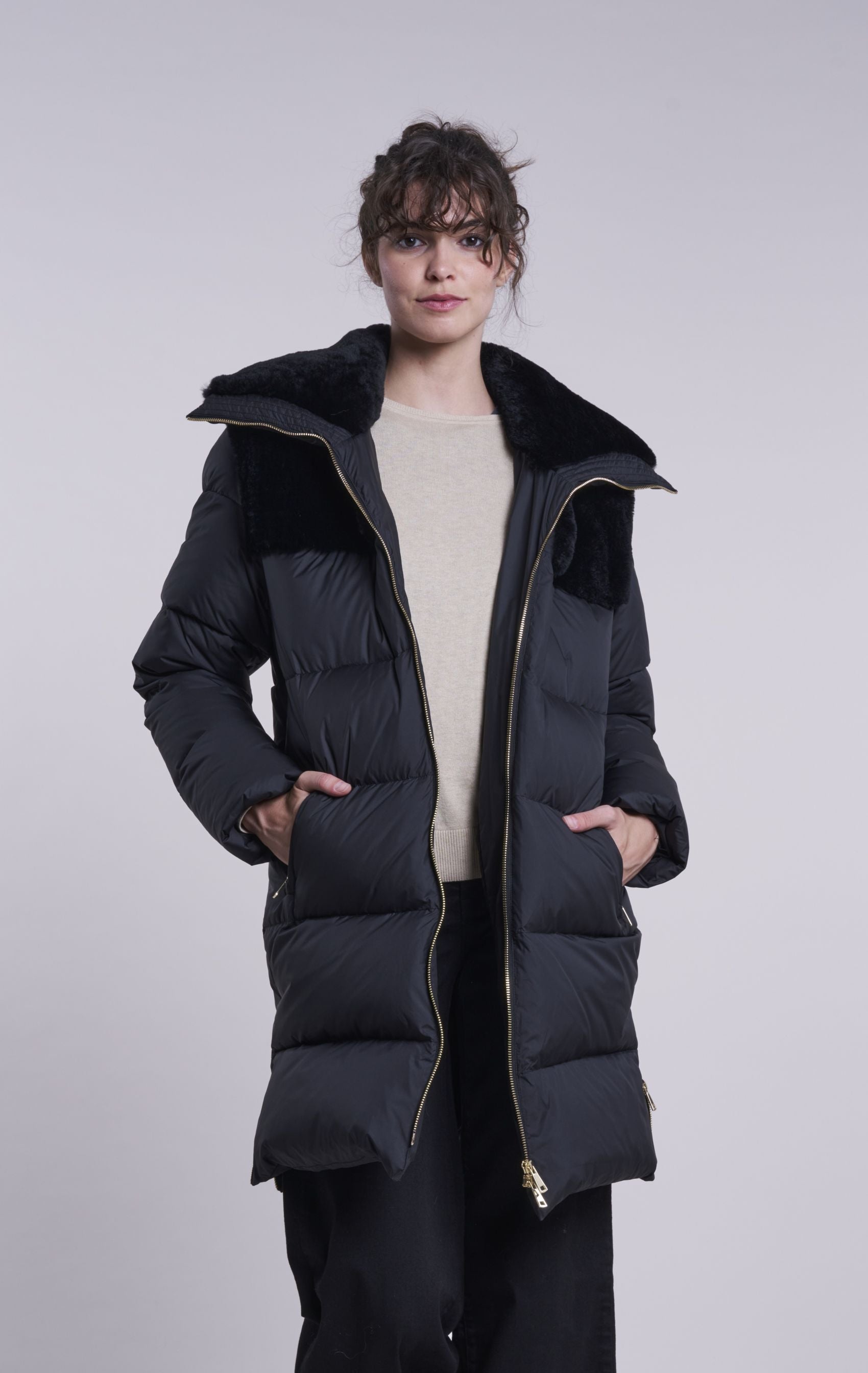 Our most popular down body enhanced with dyed to match genuine shearling yoke and collar. Light weight and warm enough for the coldest winter days and nights